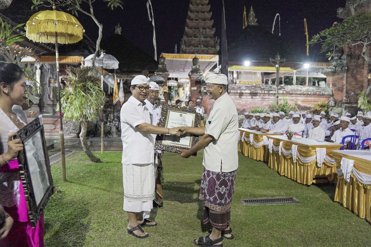 Pada kesempatan tersebut Sekda Adi Arnawa juga menerima Baligrafi dari Bendesa Adat Kapal bertempat di Pura Kahyangan Jagat Purusada, Desa Adat Kapal, Jumat (11/8). Turut hadir anggota DPRD Badung I Made Suwardana, Ni Komang Tri Ani, Kepala Dinas Kebudayaan I Gede Eka Sudarwitha, Camat Mengwi I Nyoman Suhartana, Lurah Kapal I Nyoman Adi Setiawan, Bendesa Adat Kapal I Ketut Sudarsana, para mancagra, beserta para pemedek se-Desa Adat Kapal.