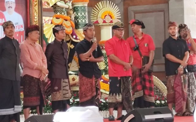 ASPIRASI – Perwakilan Aliansi Gabungan Gerakan Pengusaha Muda Gianyar I Putu Aditya menyampaikan aspirasi dan apresiasi kepada paslon Wayan Koster dan Giri Prasta (Koster-Giri) serta paslon Aman di Desa Bedulu Gianyar, Sabtu (19/10).