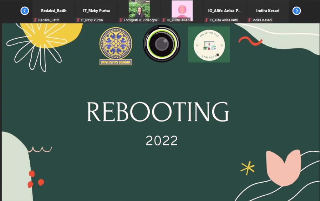 Dalam rangka meningkatkan kemampuan di bidang jurnalistik dan semangat berorganisasi, Lembaga Pers Mahasiswa (LPM) Press and Cyber Community (PCYCO) Fakultas Kedokteran Universitas Udayana menyelenggarakan acara Rebooting 2022 secara daring dengan mengangkat tema “Creating The New Era Of LPM PCYCO Through Improving Skills of Journalism and Developing Organization Spirit”, Senin, 11 Juli 2022.