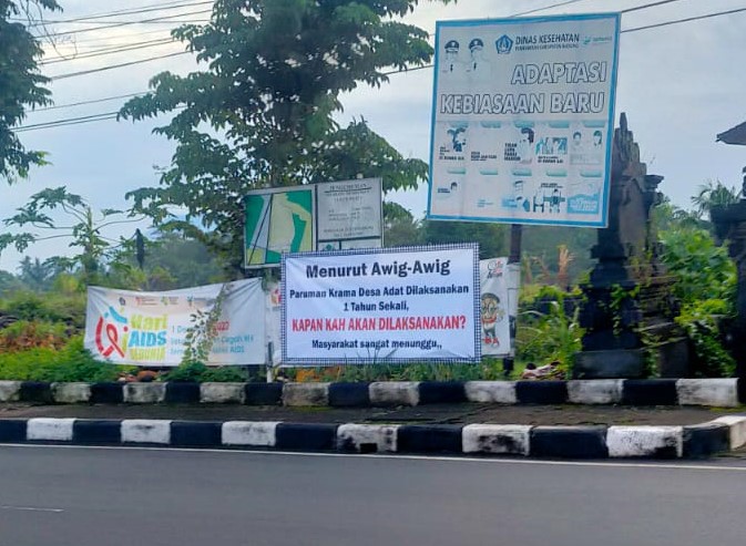Spanduk-spanduk tersebut berbunyi “Menurut awig-awig, paruman krama desa adat dilaksanakan 1 tahun sekali. Kapankah akan dilaksanakan? Masyarakat sangat menunggu”. Sedikitnya spanduk tersebut terpasang di tiga titik di wilayah Desa Adat Mengwi.