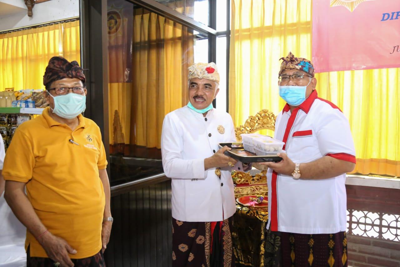 BAKSO – Ketua MDA Bali Ida Panglingsir Agung Putra Sukahet didampingi Ketua Yayasan Tresna Catur Asrama Ketut Serinama menyerahkan produk bakso produksi yayasan kepada salah seorang undangan.