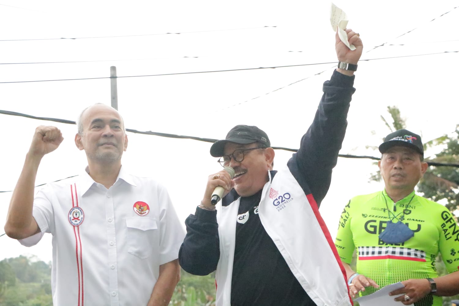 Pelepasan peserta GNFY Bali 2022 oleh Wagub Cok. Ace disaksikan oleh Sekretaris Jenderal Pengurus Besar Ikatan Sport Sepeda Indonesia (Sekjen PB ISSI) Parama Nugroho dan Direktur Poltekpar Bali, Drs. Ida Bagus Putu Puja, M.Kes. (sar/hmprov)