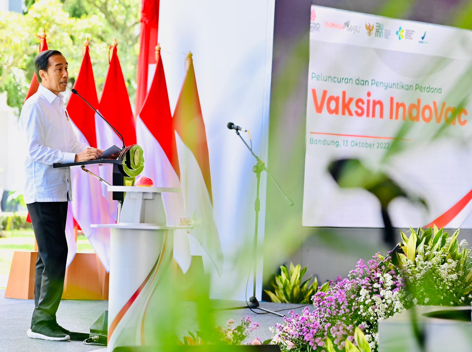 Presiden Joko Widodo meluncurkan vaksin covid-19 buatan Bio Farma, IndoVac, di Pabrik PT Bio Farma (Persero), Kota Bandung, Provinsi Jawa Barat, pada Kamis, 13 Oktober 2022. Dalam sambutannya, Presiden berharap Bio Farma terus didorong agar Indonesia bisa memiliki kemandirian dalam hal vaksin.
