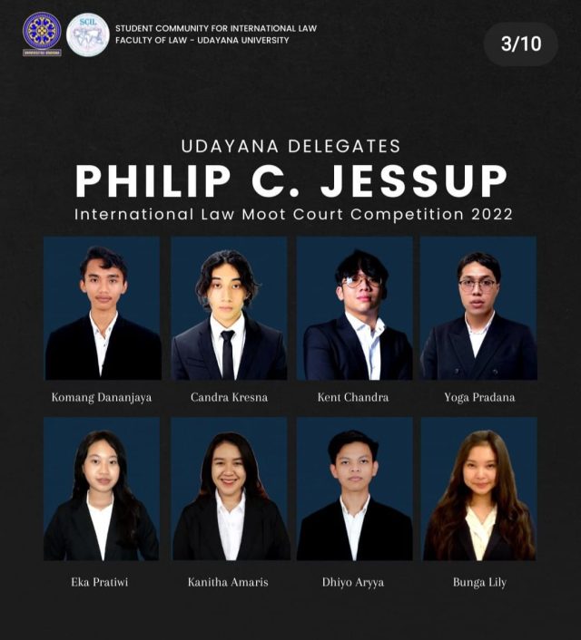 Mahasiswa Fakultas Hukum (FH) Unud yang tergabung dalam Student Community for International Law (SCIL) kembali mencetak prestasi di ajang bergengsi The Philip C. Jessup Moot Court Competition in Indonesian National Round yang diselenggarakan pada 20-27 Pebruari 2022. Delegasi Udayana terdiri dari 8 mahasiswa FH Unud, yaitu I Komang Dananjaya, Candra Kresna Wijaya, I Gede Yoga Pradana Putra, Kent Revelino Chandra, Ni Putu Ayu Eka Pratiwi, Putu Kanitha Putri Amaris, Bunga Lily Cahaya, Komang Dhiyo Aryya Pradnyana.