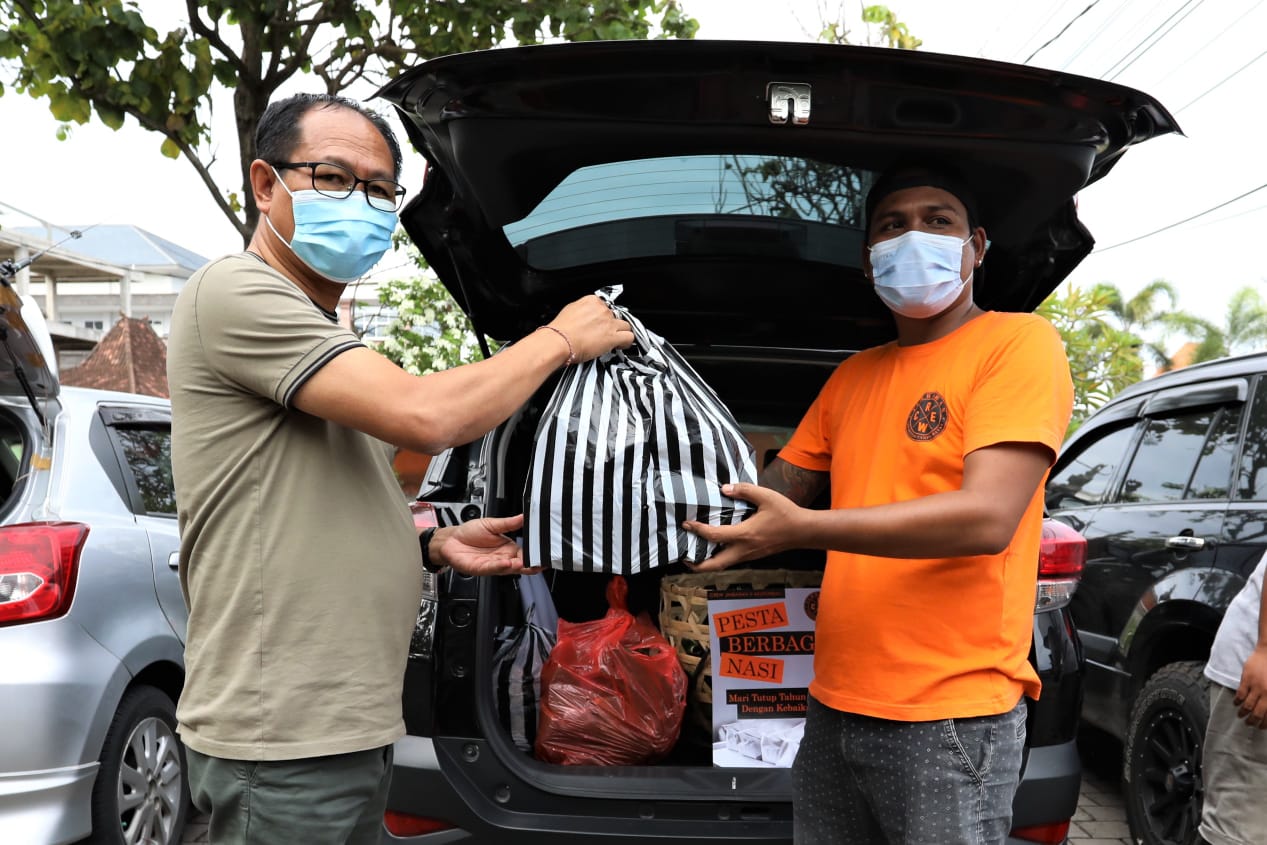 Memaknai malam pergantian tahun baru dengan rasa syukur bersama anak-anak muda Badung yang tergabung dalam Komunitas Crew Jimbaran, Wakil Bupati Badung I Ketut Suiasa berbagi tali kasih dengan membagikan 2020 nasi bungkus bagi warga yang tidak mampu menyasar warga yang berada di wilayah Jimbaran dan sekitarnya pada Kamis (31/12) sore. Dalam kegiatan yang diinisiasi oleh Crew Jimbaran bersinergi dengan Akuforbali ini, secara pribadi Wabup Suiasa ikut menyumbang 300 bungkus nasi. Acara turut dihadiri Camat Kuta Selatan Ketut Gede Arta, Lurah Jimbaran Ketut Rimbawan bersama anggota Komunitas Crew Jimbaran.