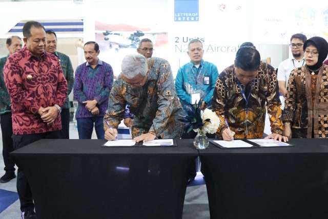 FRAMEWORK AGREEMENT – Pj. Gubernur Bali SM Mahendra Jaya menghadiri penandatanganan Framework Agreement antara PT Dirgantara Indonesia, PT Jamkrida Bali Mandara, Bali International Flight Academy, PT Nusantara Turbin & Propulsi, serta MS Tech, Sabtu (21/9).