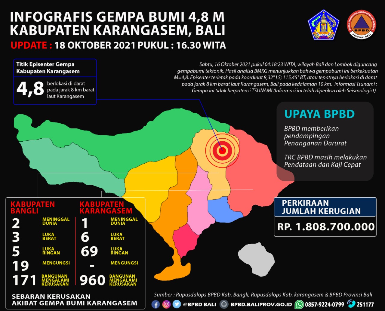 Kerugian material akibat gempa bumi bermagnitudo 4,8 di Karangasem hingga Senin (18/10) melonjak menjadi Rp 1.808.700.000. Korban tewas tetap 3 orang, satu di Karangasem dan dua di Bangli. Sementara luka berat 9 orang (6 di Karangasem dan 3 di Bangli), luka ringan 74 orang (69 di Karangasem dan 5 di Bangli.