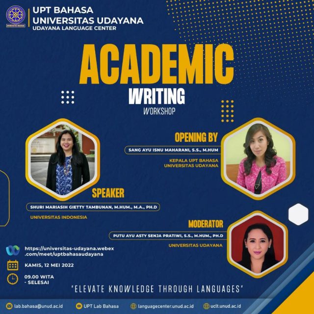UPT Bahasa Universitas Udayana (Udayana Language Center) menyelenggarakan Academic Writing Workshop yang diadakan pada Kamis (12/5/2022). Lokakarya diadakan guna meningkatkan kapasitas staf pengajar untuk menulis akademik dan dapat mempublikasikan pada jurnal terakreditasi ataupun jurnal internasional.