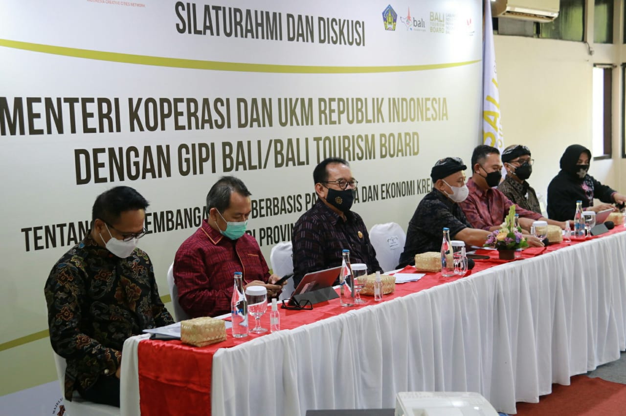 DISKUSI – Menkop Teten Masduki bersama Wagub Cok. Ace saat diskusi dengan GIPI Bali/Bali Tourism Board, Selasa (8/6).