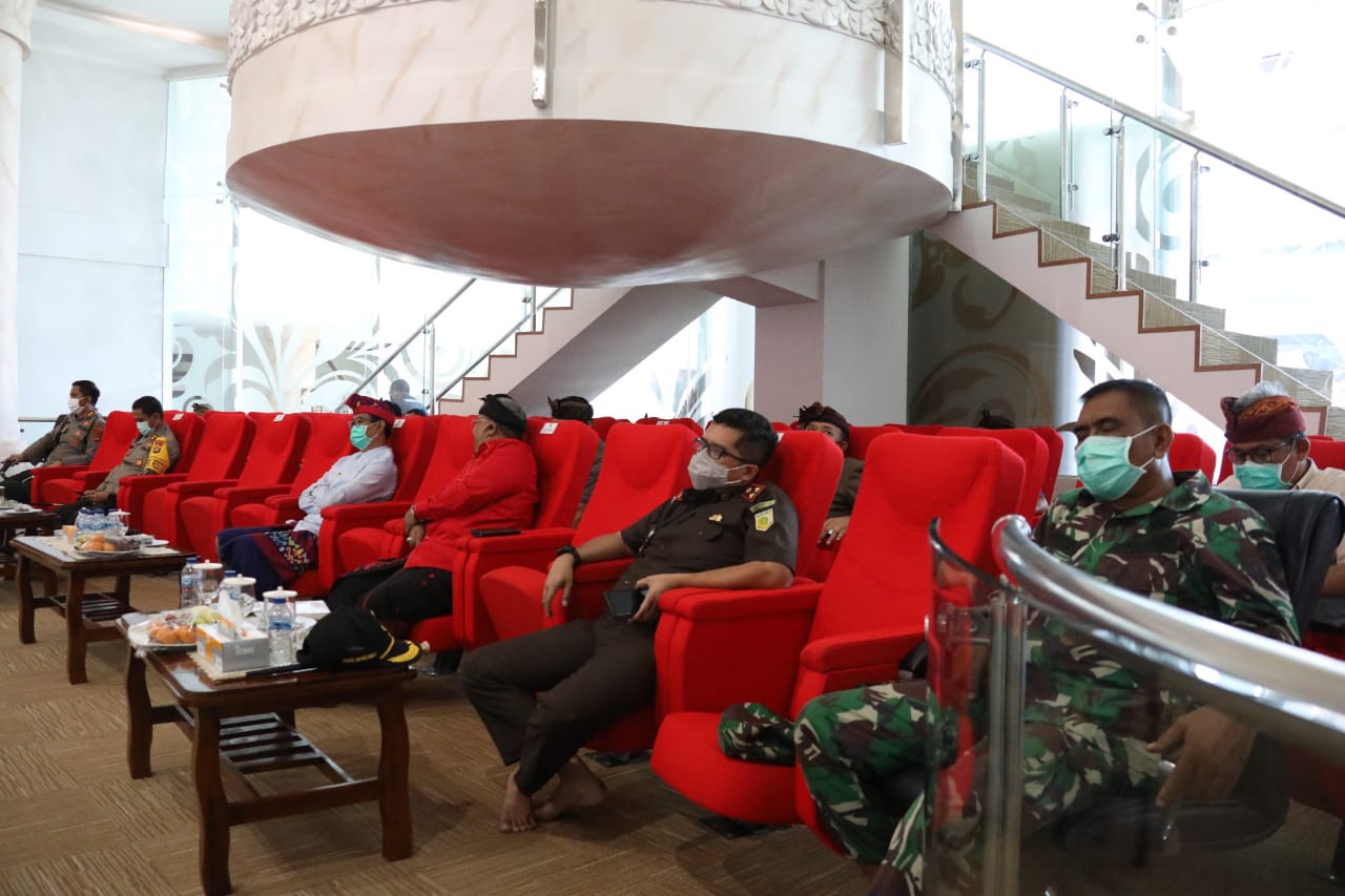 Wakil Bupati Badung I Ketut Suiasa mengikuti video conference (vidcon) rapat koordinasi bersama yang diselenggarakan Menkopolhukam Mahfud MD, Mendagri Tito Karnavian, Menkeu Sri Mulyani, Mensos Juliari Batubara, Mendes PDTT Abdul Halim Iskandar beserta kementrian terkait dengan gubernur, bupati/Walikota se-Indonesia terkait implementasi Pembatasan Sosial Berskala Besar (PSBB) di daerah dalam pencegahan penyebaran dan percepatan penanggulangan Covid-19 dari Gedung Comand Center Puspem Badung pada Kamis (9/4). Turut mendampingi Wakil Bupati di antaranya Ketua DPRD Badung Putu Parwata, Sekda Adi Arnawa, Kapolres Badung, Kapoltabes Denpasar, Kajari Badung, Dandim Badung dan Forkopimda Kabupaten Badung.