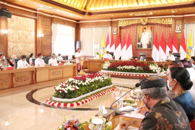 HLM – Gubernur Wayan Koster dalam acara High Level Meeting (HLM) dengan tema ‘Neraca Pangan dan Kerja Sama Antar-Daerah Provinsi Bali’, di ruang rapat Gedung Gajah Jayasabha Denpasar, Kamis (17/12/2020).
