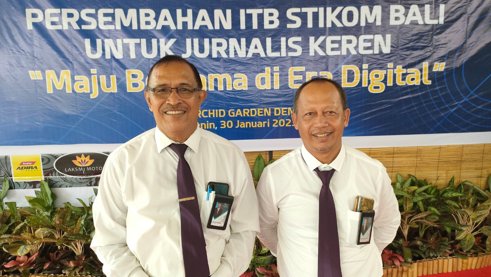 MEDIA GATHERING – Kepala SMKTI Bali Global Denpasar Drs. I Gusti Made Murjana, MPd (kiri) didampingi Kepala Tata Usaha IBN Badra Jayapati, SE (kanan) saat menghadiri acara media gathering.