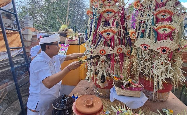 PHULA KERTI – Nuek Bagia Phula Kerti saat upacara Penyineban Karya Ngenteg Linggih, Mupuk Pedagingan dan Padudusan Alit di Parahyangan Kantor Bapenda Kota Denpasar pada Budha Pon Sungsang, Rabu (18/9).