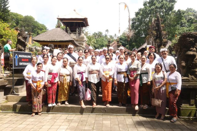 BERSAMA LANSIA – Ketua TP PKK Kota Denpasar Ny. Sagung Antari Jaya Negara bersama lansia peserta Posyandu Paripurna dari Banjar Mandala Sari, Kecamatan Denpasar Denpasar Timur, saat melaksanakan Darma Yatra di Pura Tirta Empul, Rabu (6/12).