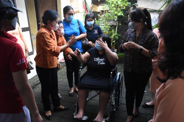 KURSI RODA – Ketua K3S Denpasar Ny. Antari Jaya Negara menyerahkan bantuan kursi roda kepada salah seorang warga, Rabu (24/11/2021).