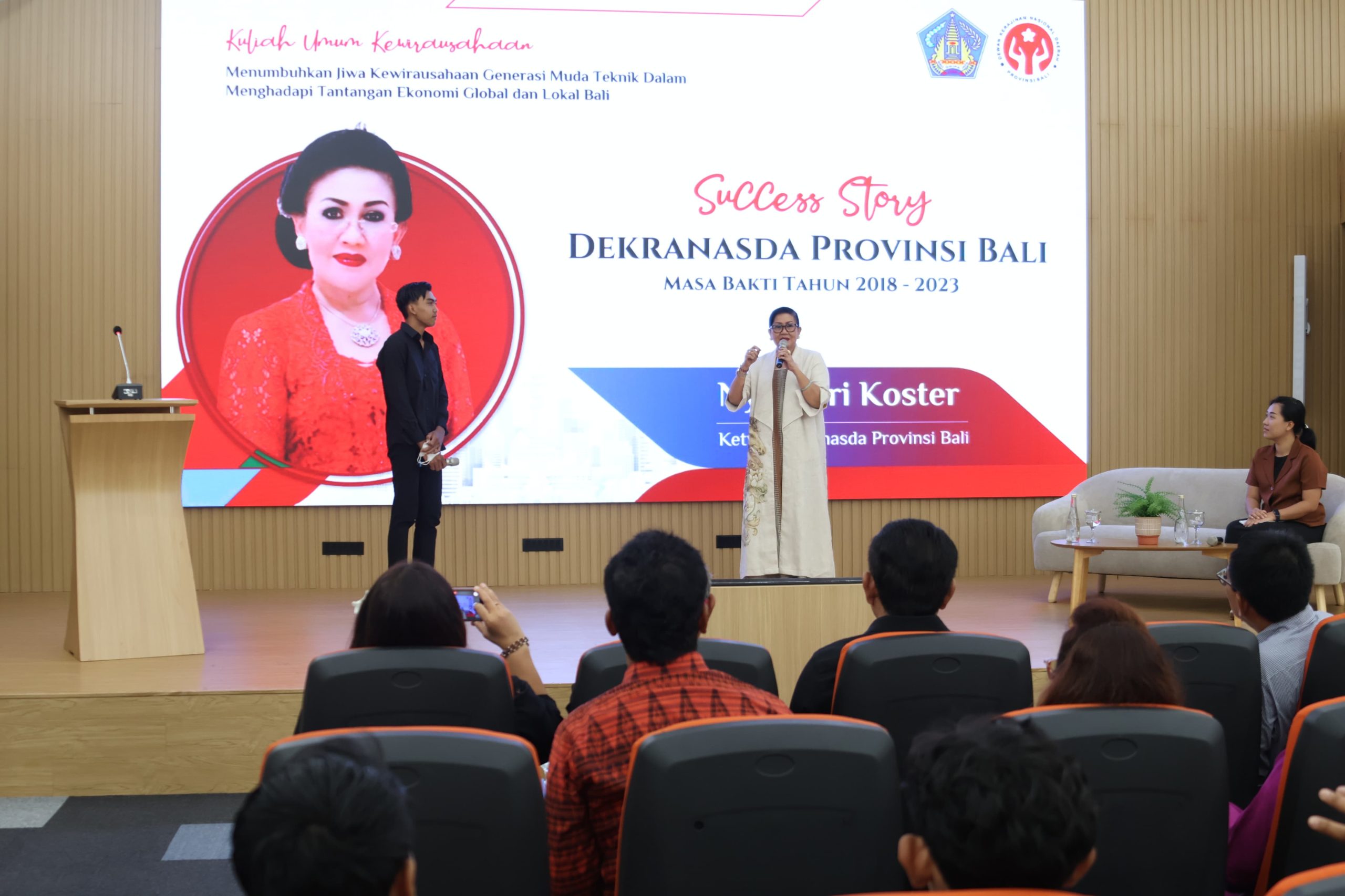 Ketua Dekranasda Provinsi Bali Ny. Putri Koster mengajak mahasiswa teknik di Bali untuk turut berkontribusi dalam pembangunan Pusat Kebudayaan Bali. Hal ini disampaikannya saat menjadi dosen tamu dalam kuliah umum kewirausahaan Fakultas Teknik Universitas Warmadewa, Sabtu (22/3).
