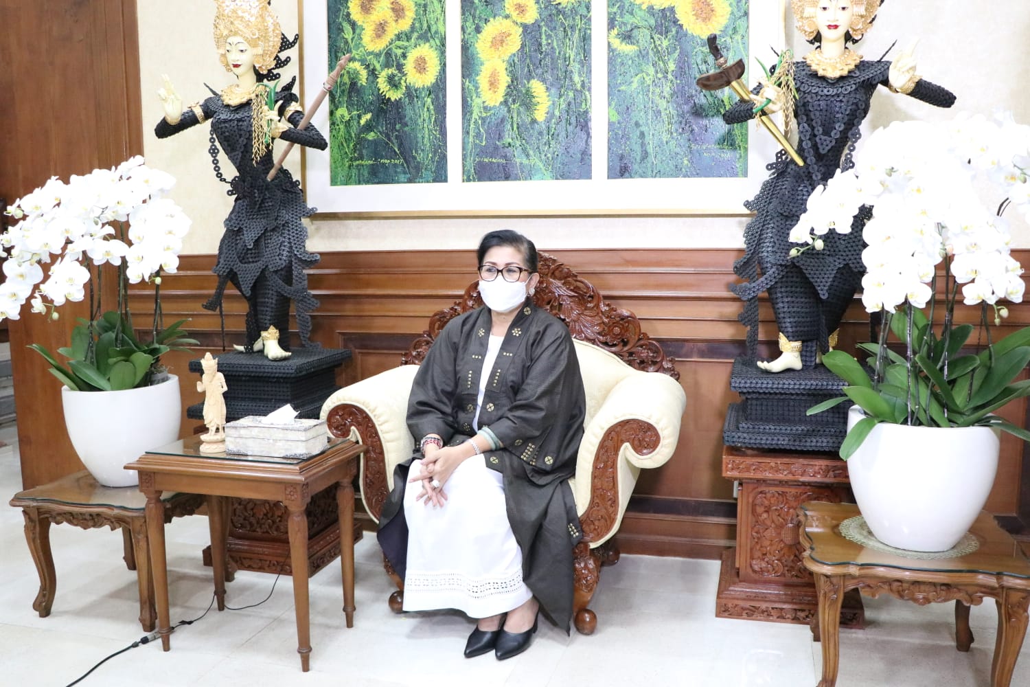 “Alam semesta mengajarkan kita untuk sabar dan tidak mudah menyerah, mari berbenah diri. Yang dahulunya kita nyaman dengan gemericik dolar yang didatangkan dunia pariwisata, sehingga saat ini perlu diwujudkan topangan perputaran ekonomi layaknya segitiga sama sisi yang saling menguatkan. Apabila satu kaki terpuruk (seperti bidang pariwisata saat ini) maka masih ada dua kaki (bidang UMKM dan bidang pertanian) yang menguatkan,” tambah Ny. Putri Koster.