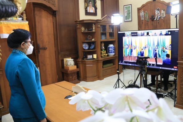 Ketua Tim Penggerak Pemberdayaan dan Kesejahteraan Keluarga (TP PKK) Provinsi Bali Ny. Putri Suastini Koster menghadiri kegiatan pelantikan Ketua TP PKK Sulawesi Utara dan Kalimantan Utara masa bakti 2021-2026 secara daring melalui aplikasi zoom meeting, dari ruang kerjanya di Gedung Jayasabha, Senin (15/2/2021).