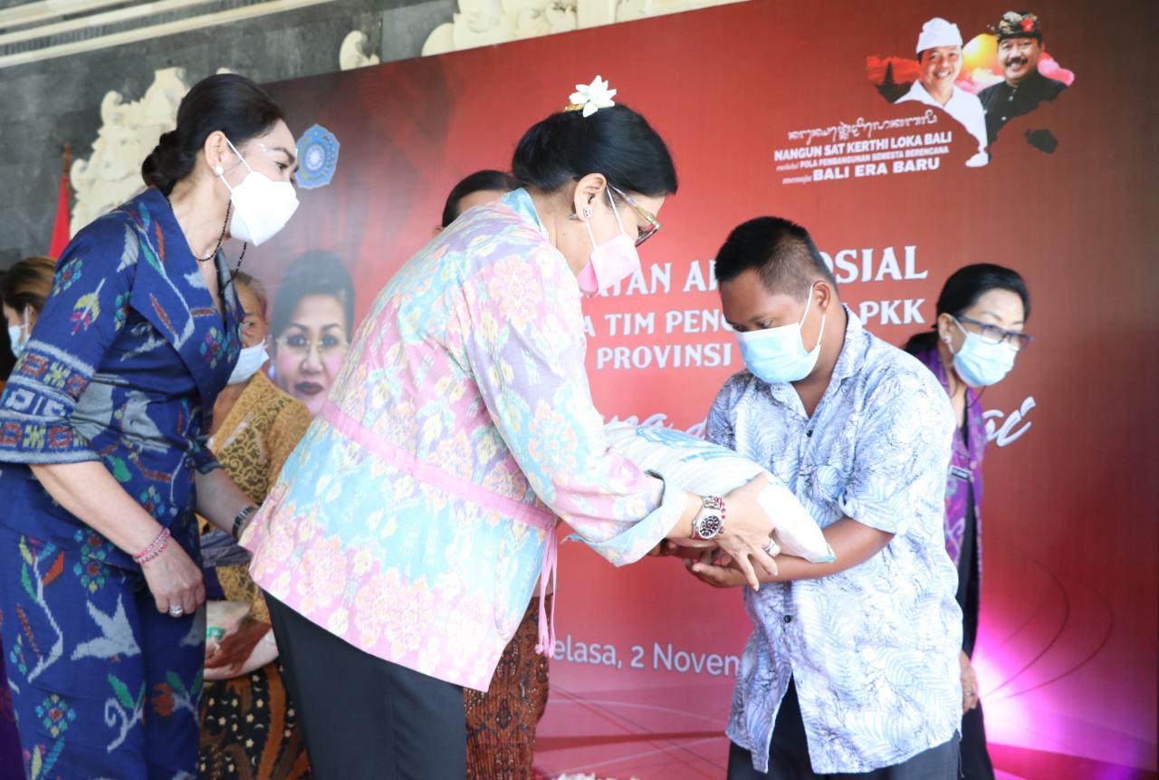 BANTUAN – Ketua TP PKK Bali Ny. Putri Koster menyerahkan bantuan pada Aksi Sosial Dalam Rangka Menyapa dan Berbagi, Selasa (2/11/2021).
