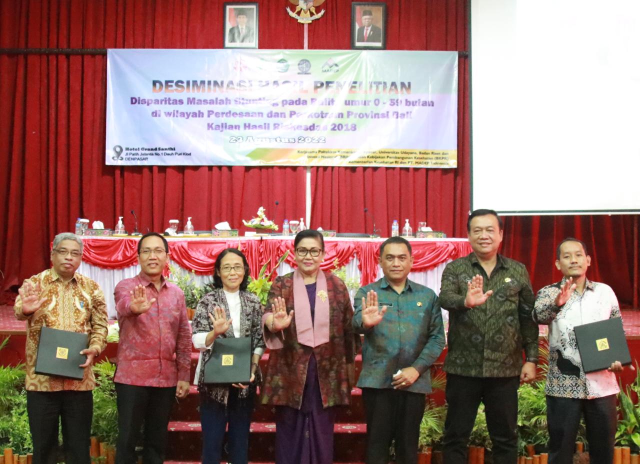 Sementara itu, Ketua Tim Peneliti Dr. AA Ngurah Kusumajaya menyampaikan, yang dikaji timnya adalah hasil Riskesdas Tahun 2018. Kajian ini diharapkan mampu memberi gambaran bagi tim penurunan angka stunting untuk menetapkan prioritas yang harus digarap. Kegiatan diseminasi melibatkan perwakilan Dinas Sosial, Dinas Kesehatan, Dinas PMD Provinsi dan Kabupaten/Kota serta 120 Kepala Puskesmas.