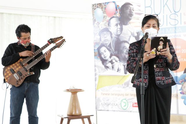 BACA PUISI – Diiringi gitaris Balawan, Ny. Putri Suastini Koster membaca puisi saat menghadiri peluncuran Antologi Puisi Gajah Mina dan membuka Pameran Lukisan dan Sketsa karya Made Gunawan, Selasa (23/2).