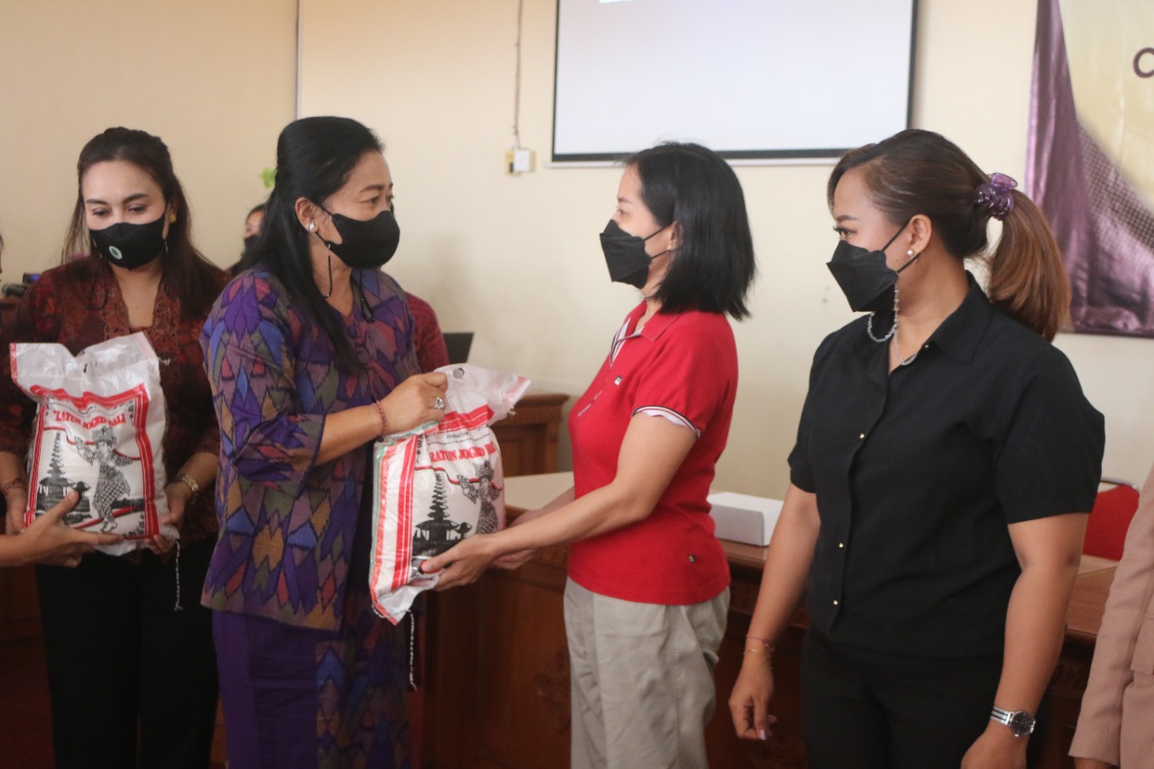 BANTUAN BERAS – Ketua TP PKK Kota Denpasar Ny. Sagung Antari Jaya Negara membuka capacity building dan menyerahkan bantuan beras dari TP PKK Bali, Selasa (17/5/2022).