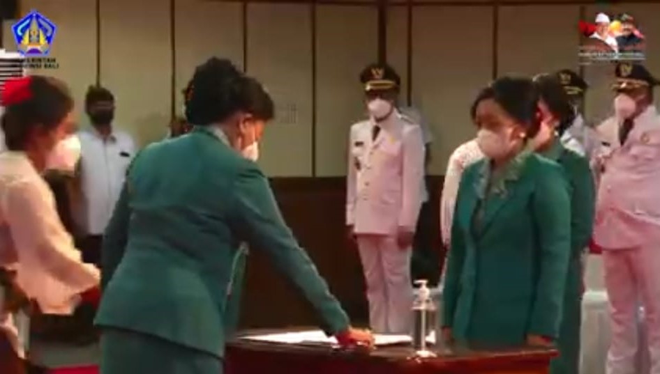 Ny. Sagung Antari Jaya Negara resmi dilantik menjadi Ketua Tim Penggerak PKK Kota Denpasar dan Ketua Dewan Kerajinan Nasional Daerah (Dekranasda) Kota Denpasar periode 2021-2024 oleh Ketua Tim Penggerak PKK yang juga Ketua Dekranasda Provinsi Bali, Ny. Putri Koster usai pelatikan Wali Kota dan Wakil Wali Kota di Kantor Gubenur Bali, Jumat (26/2).