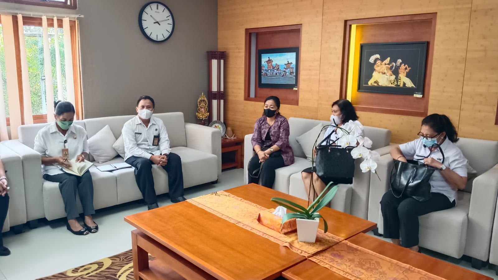HAN – Ketua TP PKK Kota Denpasar Ny. Antari Jaya Negara menerima Sekretaris Dinas Pemberdayaan Perempuan dan Perlindungan Anak Pengendalian Penduduk dan Keluarga Berencana Kota Denpasar Ni Made Puspitasari serangkaian Hari Anak Nasional (HAN).