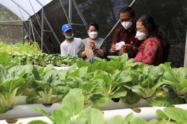 HIDROPONIK – Ketua TP PKK Badung Ny. Seniasih Giri Prasta saat meninjau pelaksanaan vaksinasi, kebun tanaman organik dan hidroponik di areal Ayana Resort & Spa, Selasa (25/5).