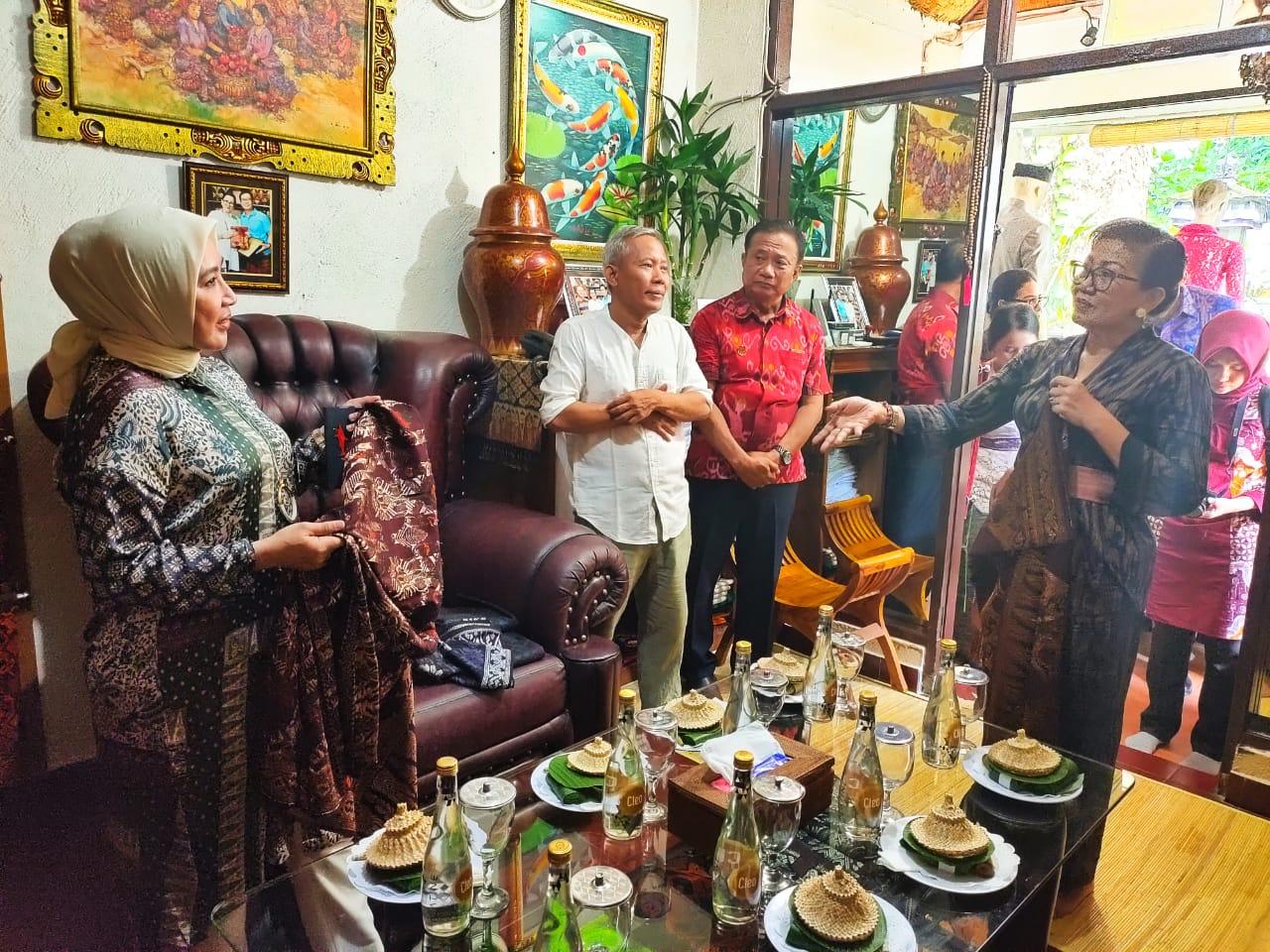 ENDEK – Ketua Harian Dekranasda Ny. Tri Tito Karnavian didampingi Ny. Putri Koster saat mengunjungi perajin endek dan songket di Denpasar.
