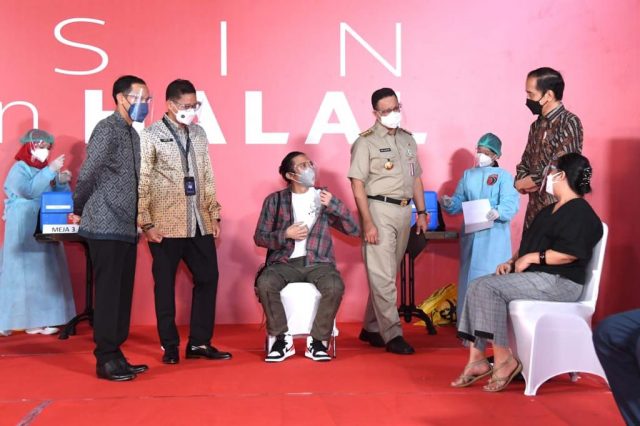 VAKSINASI – Presiden Joko Widodo didampingi Menparekraf Sandiaga Uno meninjau vaksinasi masal untuk kalangan budayawan, Senin (19/4).