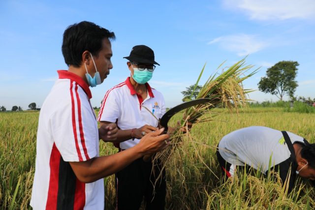 Kepala Dinas Pertanian dan Tanaman Pangan Kabupaten Badung I Wayan Wijana melakukan pemotongan rinai padi organik di Subak Ayunan Abiansemal, Jumat (15/10). Turut hadir dalam panen tersebut Duta Farming dari ITB Made Marna, Pekaseh Ayunan I Ketut Parwata, Babinsa dan Kapolsek Abiansemal. Panen perdana padi organik di Subak Ayunan, melalui binaan dari Dinas Pertanian Tanaman Pangan dan pendamping ahli pertanian ITB telah melakukan yang terbaik langkah-langkah kongkret dan nyata bagi masyarakat petani di Ayunan dan hasil padi organik yang dipanen cukup menjanjikan.