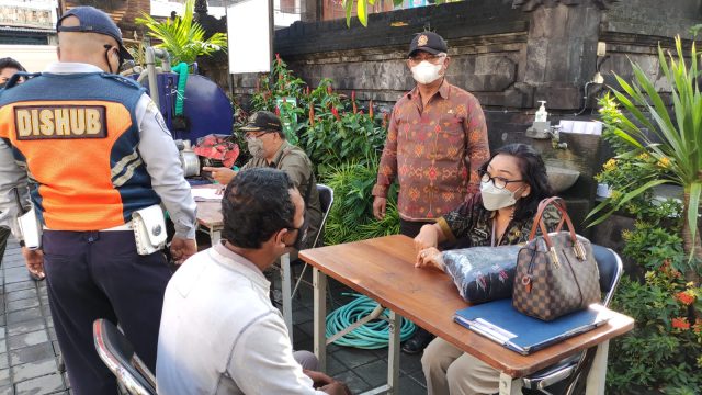 Tim Yustisi yang merupakan aparat gabungan dari unsur Satuan Polisi (Satpol PP) Kota Denpasar, Dinas Perhubungan Kota Denpasar, unsur TNI-Polri, dan perangkat Desa Tegal Kertha melakukan pemeriksaan kepada warga dan pengendara motor yang melintas dan kedapatan tidak memakai masker.