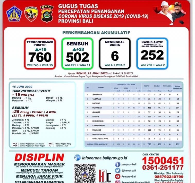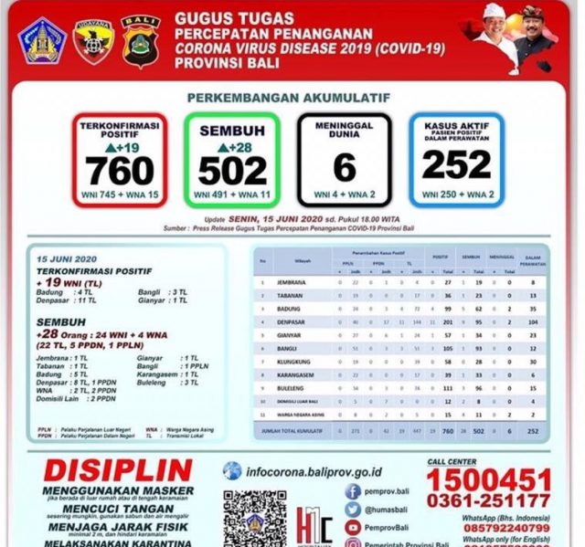 Update covid-19 Senin (15/6) ini,  jumlah kumulatif pasien positif Covid-19 di Bali mencapai 760 orang. Ini artinya ada penambahan 19 orang WNI, dengan rincian 19 orang transmisi lokal.