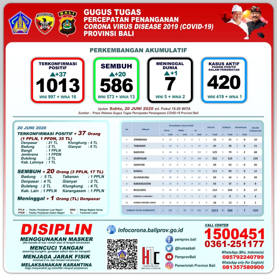 Secara kumulatif, jumlah pasien covid-19 mencapai 1.013 orang setelah Sabtu (20/6) ada tambahan 37 orang. Tambahan ini berasal dari 1 pelaku perjalanan luar negeri (PPLN), 1 pelaku perjalanan dalam negeri (PPDN), dan 35 orang berasal dari transmisi lokal. Hal tersebut diungkapkan Ketua Harian Gugus Tugas Percepatan Penanganan Covid-19 Provinsi Bali Dewa Made Indra.