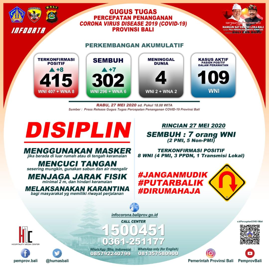 Terkiat udate kasus, ujar Ketua Harian Gugus Tugas Percepatan Penanganan Covid-19 Provinsi Bali Dewa Made Indra, jumlah kumulatif pasien positif 415 orang. Ini artinya bertambah 8 orang WNI, terdiri atas 4 orang PMI, 3 orang imported case (Indonesia) dan 1 orang transmisi lokal.