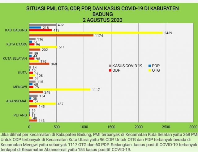 Pada Minggu (2/8), ada penambahan 6 kasus positif sehingga total kasus positif Covid-19 di Badung kini menjadi 492 orang (100 PDP, 14 ODP, 362 OTG, 16 PMI). Hal ini dikatakan Koordinator Kehumasan Gugus Tugas Percepatan Penanganan Covid-19 Badung GN Jaya Saputra.