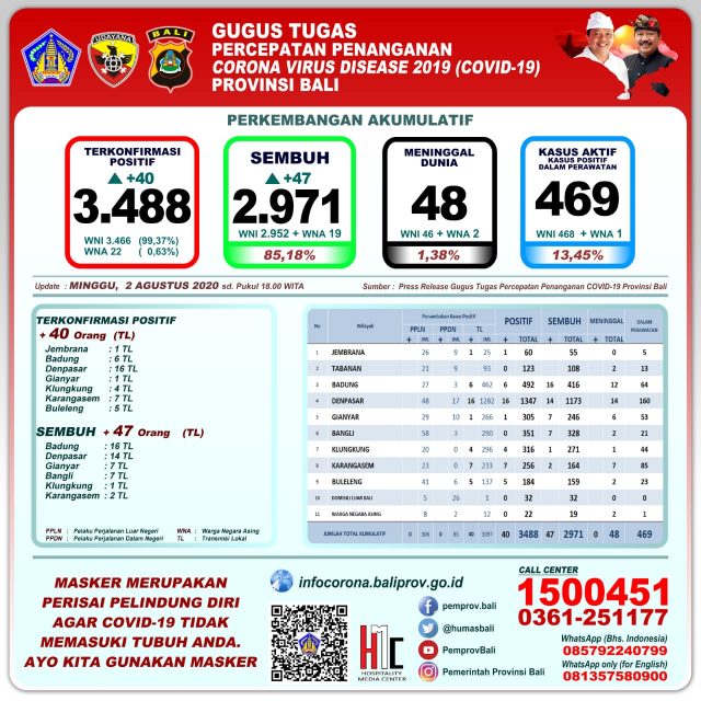 Gugus Tugas Percepatan Penanganan Covid-19 Provinsi Bali menyampaikan perkembangan penanganan corona virus disease (covid-19) di Provinsi Bali per Minggu (2/8). Jumlah kumulatif pasien positif 3.488 (bertambah 40 orang transmisi lokal).