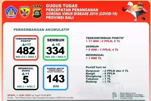 Terkait update kasus, ujar Ketua Harina Gugus Tugas Percepatan Penanganan Covid-19 Bali Dewa Made Indra, jumlah kumulatif pasien positif 482 orang (bertambah 17 orang WNI, terdiri atas 8 orang PMI dan 9 orang transmisi lokal.