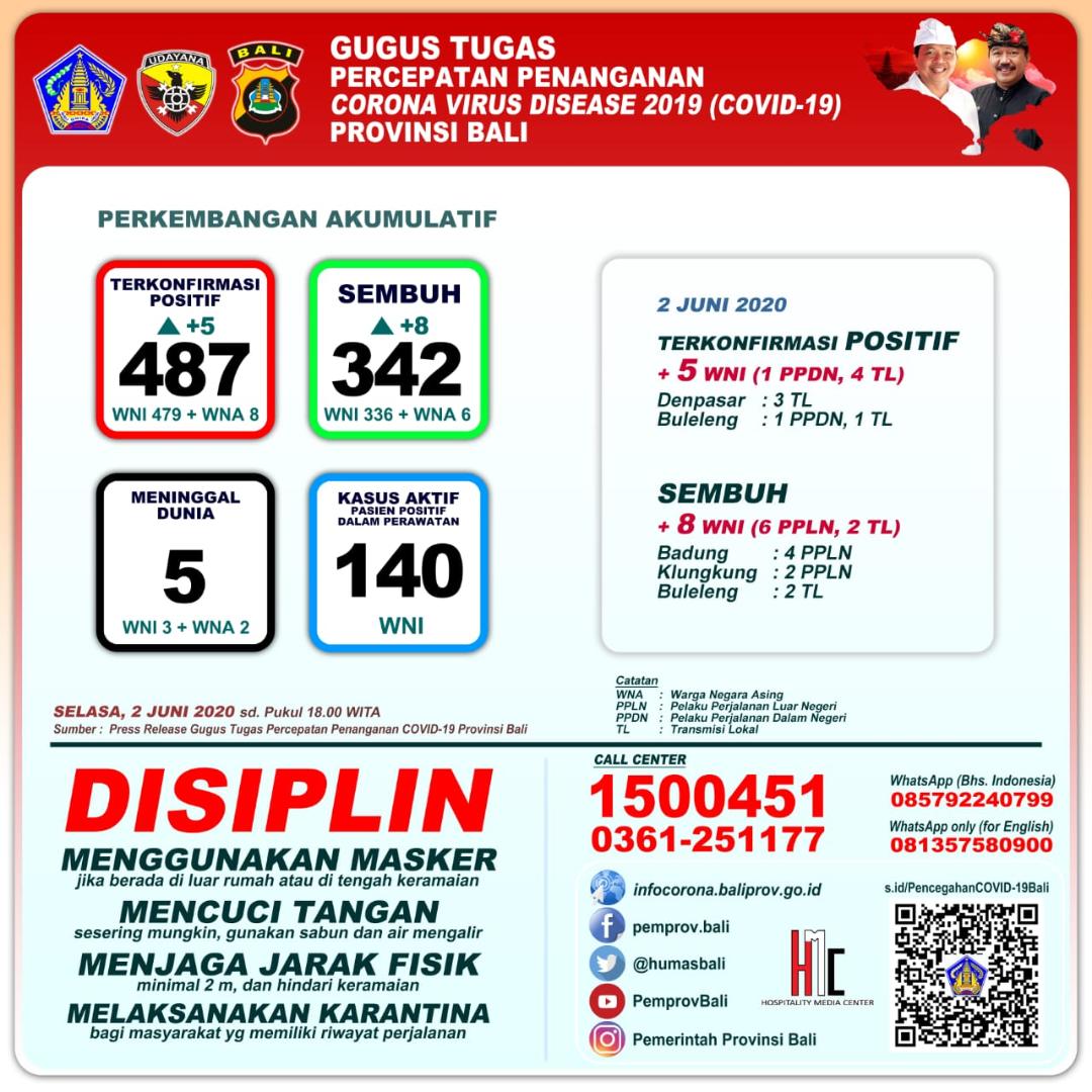 Terkait update kasus, ujar Ketua Harian Gugus Tugas Percepatan Penanganan Covid-19 Bali Dewa Made Indra, jumlah kumulatif pasien positif 487 orang. Ini artinya bertambah 5 orang WNI, terdiri dari 1 orang imported case (Indonesia) dan 4 orang transmisi lokal.