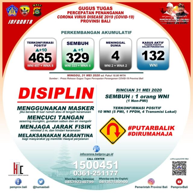 Terkait update kasus, ujar Ketua Harian Gugus Tugas Percepatan Penanganan Covid-19 Bali Dewa Made Indra, jumlah kumulatif pasien positif 465 orang. Ini artinya ada tambahan 10 orang WNI, terdiri atas 5 orang PMI dan 1 orang pelaku perjalanan dalam negeri dan 4 transmisi lokal.