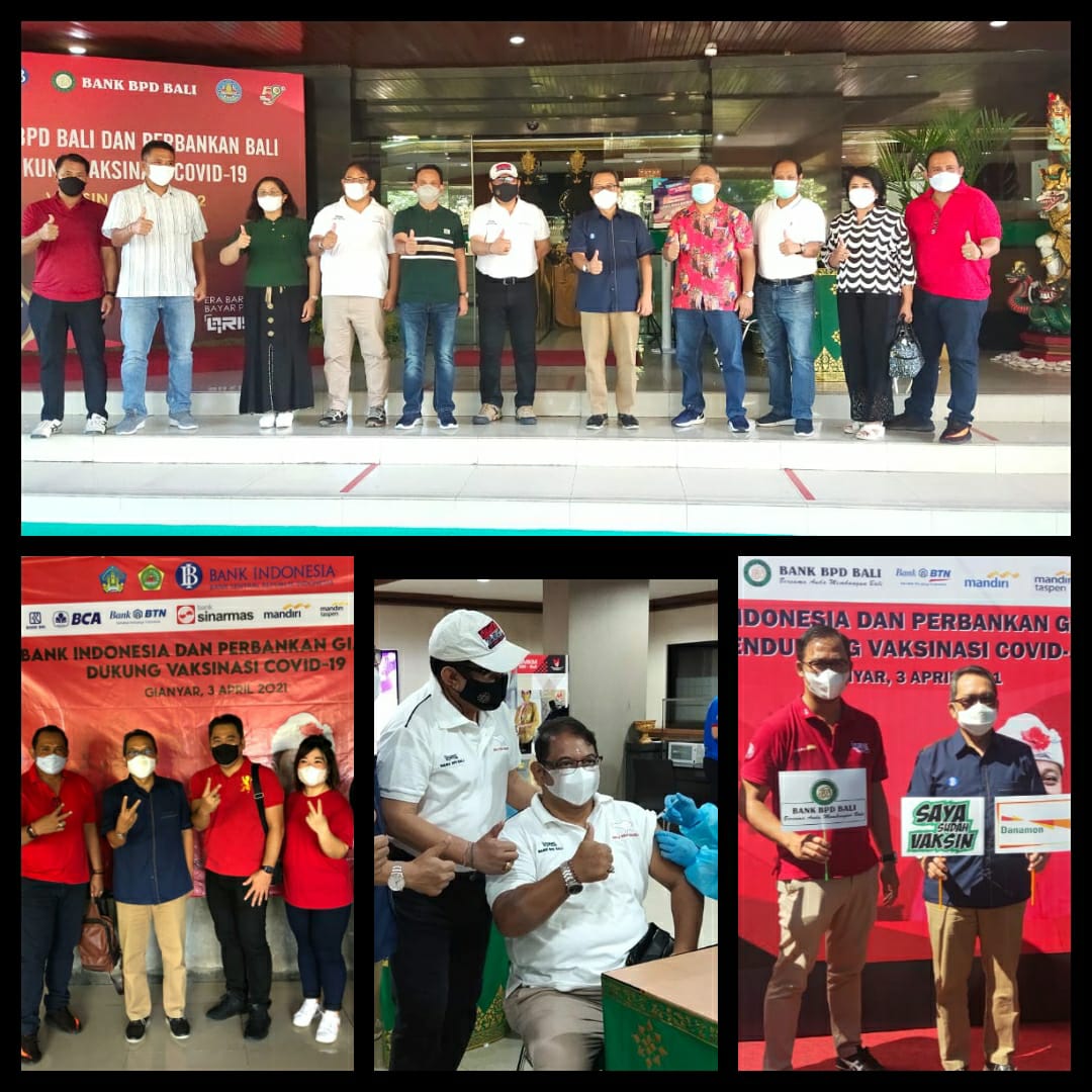 pelaksanaan vaksin ke-2 dan diikuti sekitar 500 orang. Sementara di Gianyar untuk vaksin yang pertama bagi 1.000 pegawai, yaitu BPD KC Gianyar melayani sekitar 500 pegawai di kota Gianyar dan Bank Sinar Mas untuk 500 pegawai di wilayah Ubud. Program vaksinasi bagi pegawai perbankan ini telah dilakukan di 5 (lima) kota, yaitu Denpasar, Singaraja, Jembrana, Klungkung dan Gianyar, dan sekitar 2.800 pegawai telah dilakukan vaksin.