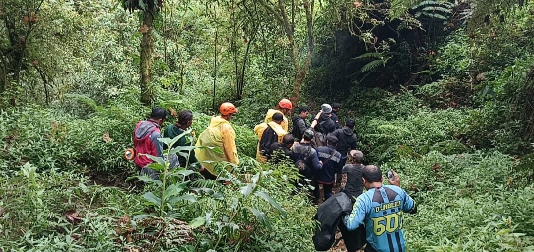 DIEVAKUASI – Korban yang diduga meninggal karena serangan jantung berhasil dievakuasi dari Gunung Abang, Senin (10/4/2023).