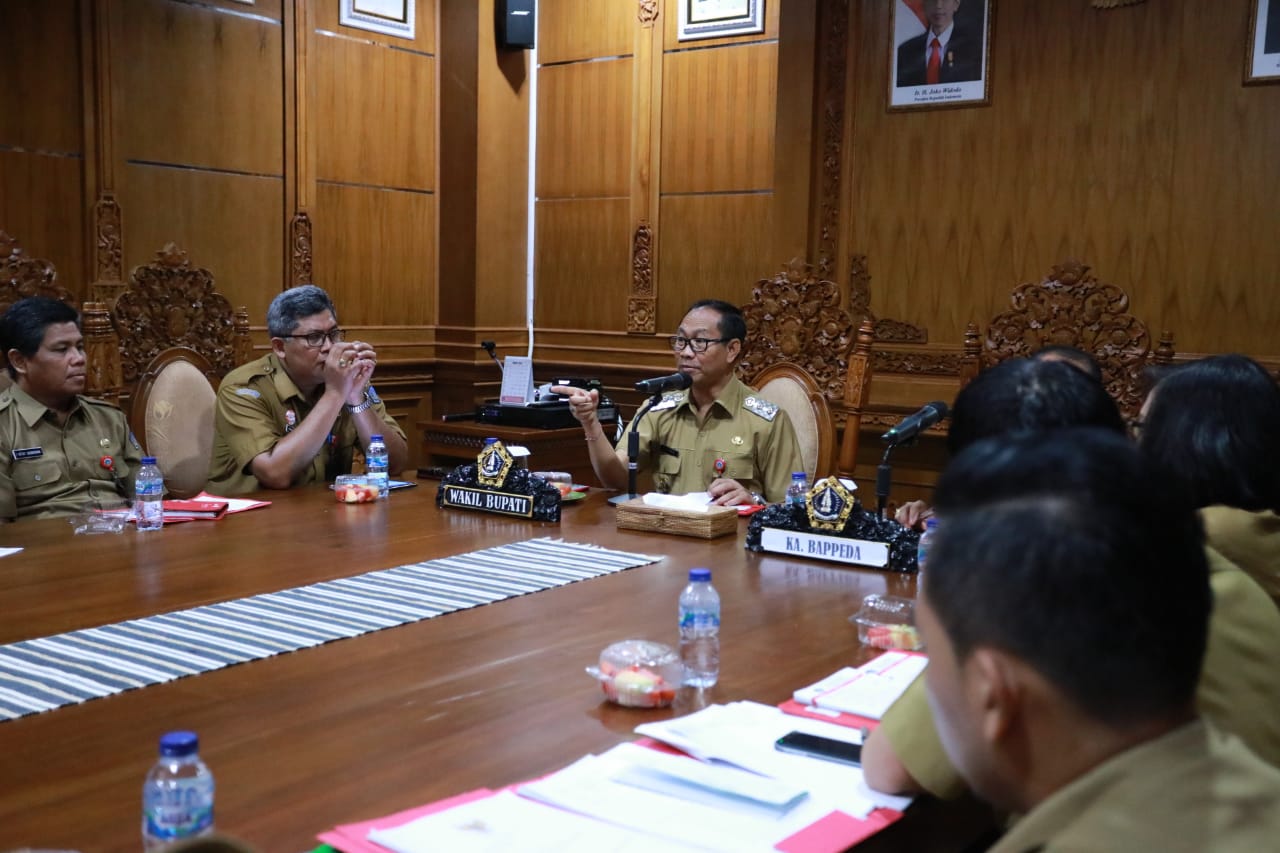 RAKOR – Wakil Bupati Badung I Ketut Suiasa didampingi Kepala Bappeda I Made Wira Dharmajaya saat rapat koordinasi sinkronisasi pendataan pemberian iuran jaminan kesehatan di Puspem Badung, Selasa (14/1).