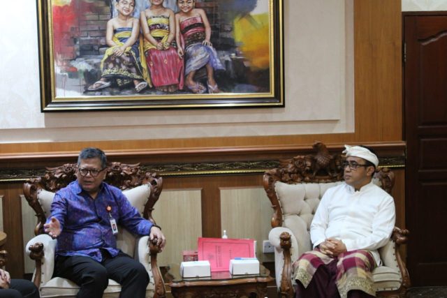 Walikota Denpasar, IGN Jaya Negara menerima Kepala Otoritas Jasa Keuangan Regional 8 Bali Nusra, Giri Tribroto membahas mengenai cara mengatasi permasalahan sampah dari hulu. Pembahasan dilakukan di Ruang Walikota Denpasar, Senin (13/2/2023).