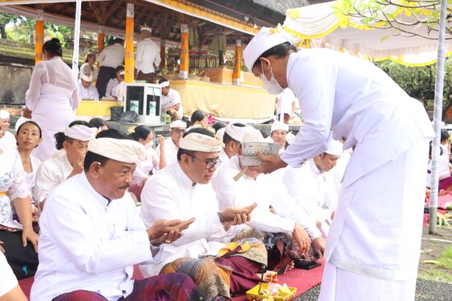 TUMPEK KRULUT – Walikota Denpasar, IGN  Jaya Negara mengikuti Upacara Jana Kerthi dalam rangka memperingati Pitenget Tumpek Krulut sebagai sebagai Rahina Tresna Asih/Hari Kasih Sayang di Pura Agung Jagatnatha Denpasar, Sabtu (18/2).