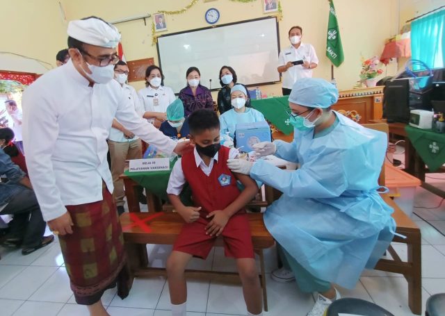 Pemkot Denpasar melaksanakan vaksinasi covid-19 untuk anak usia 6 hingga 11 tahun untuk meminimalisir penularan covid-19. Kick off vaksinasi covid-19 untuk anak ditinjau langsung Walikota Denpasar, IGN Jaya Negara berlokasi di SD Widya Sakti Penatih Denpasar, Rabu (15/12).