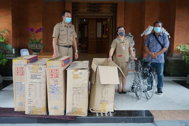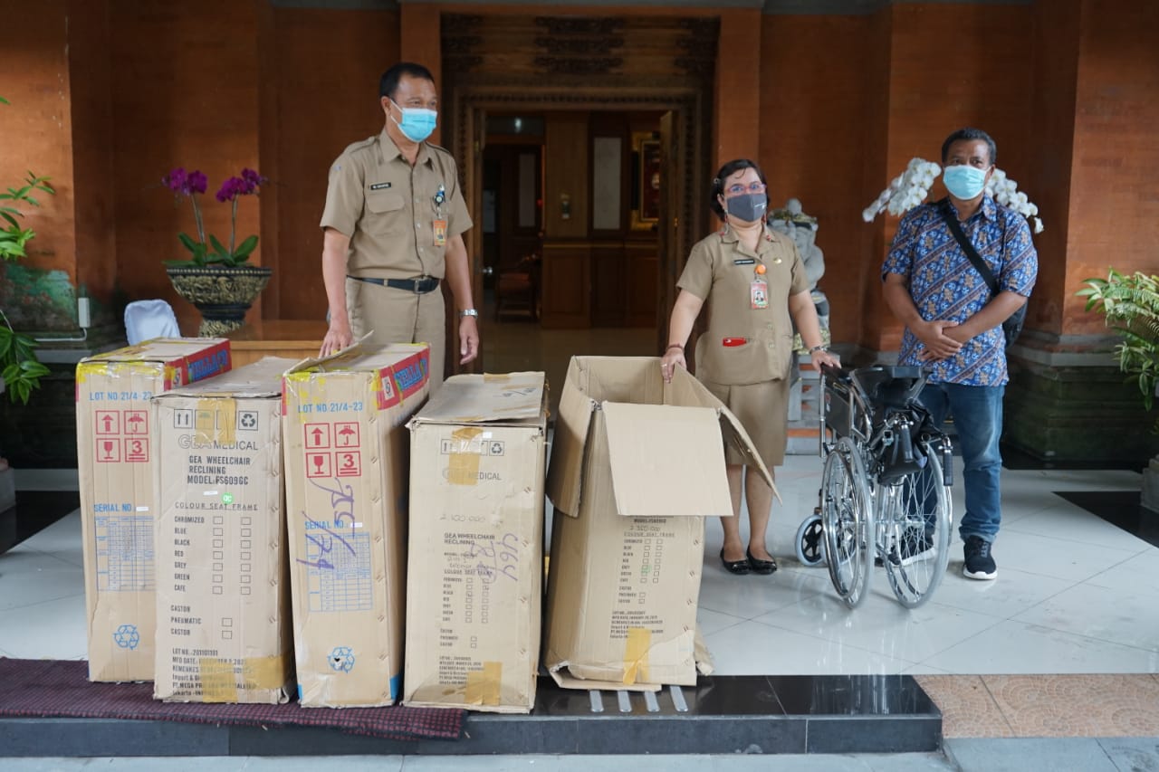 KURSI RODA – Pemkot Denpasar menerima bantuan kursi roda dari TBG, Senin (2/8/2021).