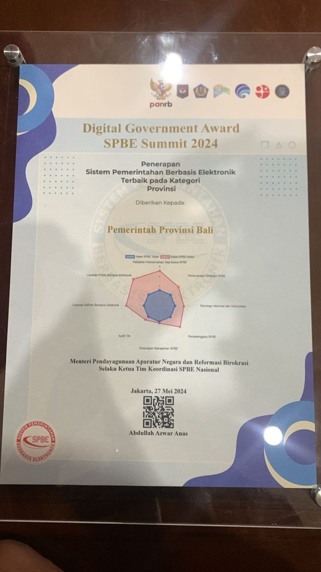 Sebagai salah satu provinsi yang menerapkan layanan digital di lingkungan pemerintahan dan terus berbenah setiap tahunnya, Pemerintah Provinsi Bali kali ini berhasil menyabet penghargaan Digital Government Award SPBE Summit 2024 dalam Penerapan Sistem Pemerintahan Berbasis Elektronik Terbaik untuk Kategori Provinsi yang diserahkan langsung Presiden Republik Indonesia Joko Widodo dan diterima Penjabat (PJ) Gubernur Bali SM Mahendra Jaya pada acara SPBE Summit 2024 dan Peluncuran Govtech Indonesia yang dibuka Presiden RI Joko Widodo bertempat di Istana Negara pada Senin (27/5).