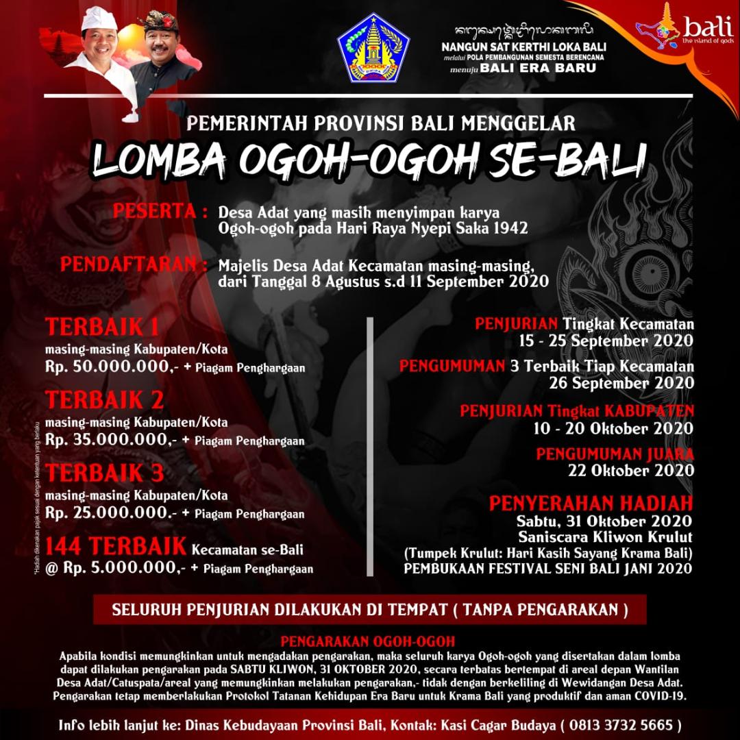 Pramana mengatakan, Lomba Ogoh-ogoh dengan desa adat se-Bali yang masih menyimpan karya Ogoh-ogoh Hari Raya Nyepi Saka 1942. Prajuru atau Yowana dapat mendaftarkan keikutsertaannya melalui Majelis Desa Adat Kecamatan masing-masing, dari tanggal 8 Agustus-11 September 2020. Penjurian tingkat kecamatan dilakukan pada 15-25 September 2020 dan tiga terbaik akan diumumkan pada tanggal 26 September 2020. Selanjutnya penjurian tingkat kabupaten/kota akan dilakukan dari tanggal 10-20 Oktober 2020 dan hasilnya diumumkan pada tanggal 22 Oktober 2020.